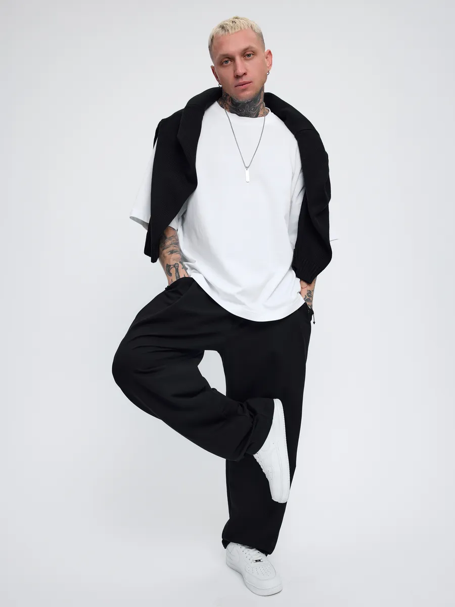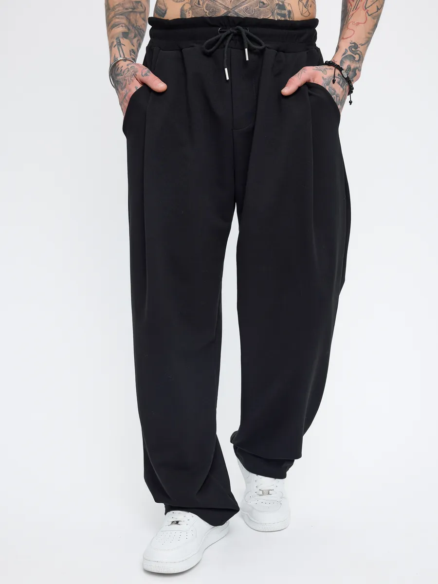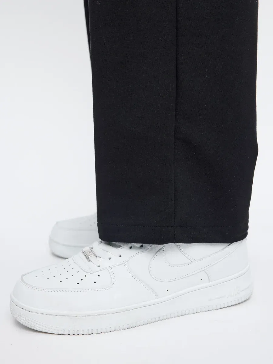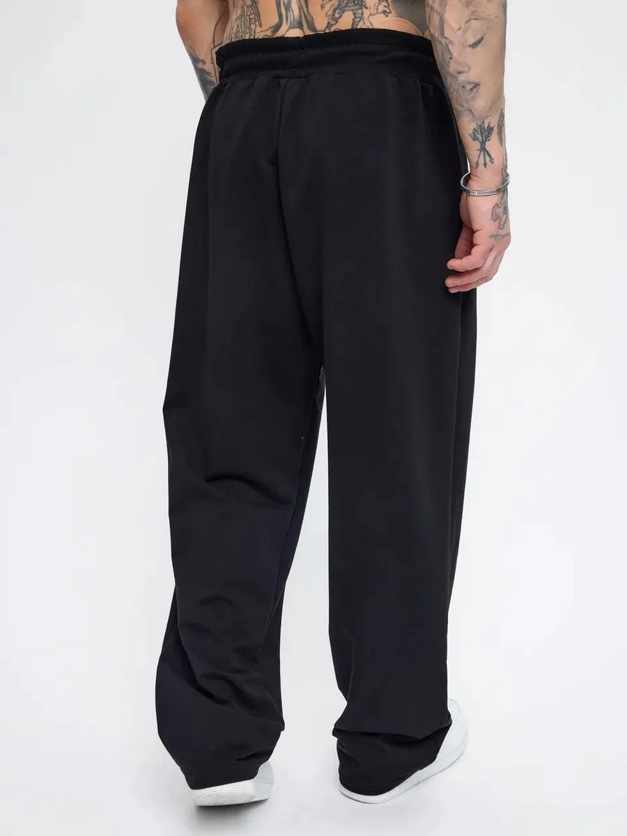 Чёрные брюки свободного кроя — универсальная UNISEX модель для мужчин и для женщин - на выход, в офис, для бега и тренировок в зале. Выполнены в прямом широком силуэте, обеспечивают комфорт и не ограничивают движения.