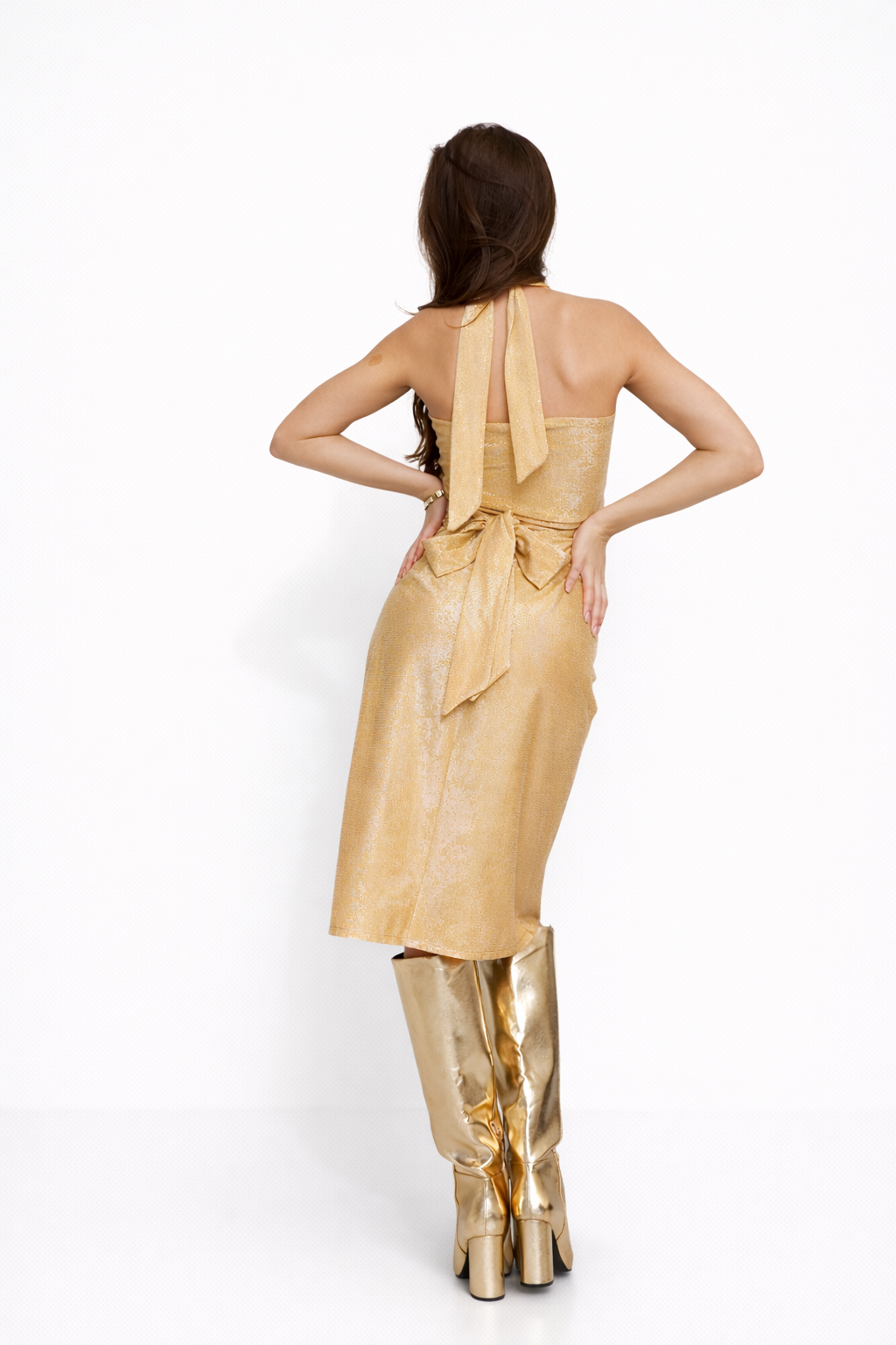 В комплект к топу, в продаже представлены юбки с запахом длина Миди и Мини цвета Золото, ассиметричного конструктива садится на любую фигуру и на размер с 42 по 50.